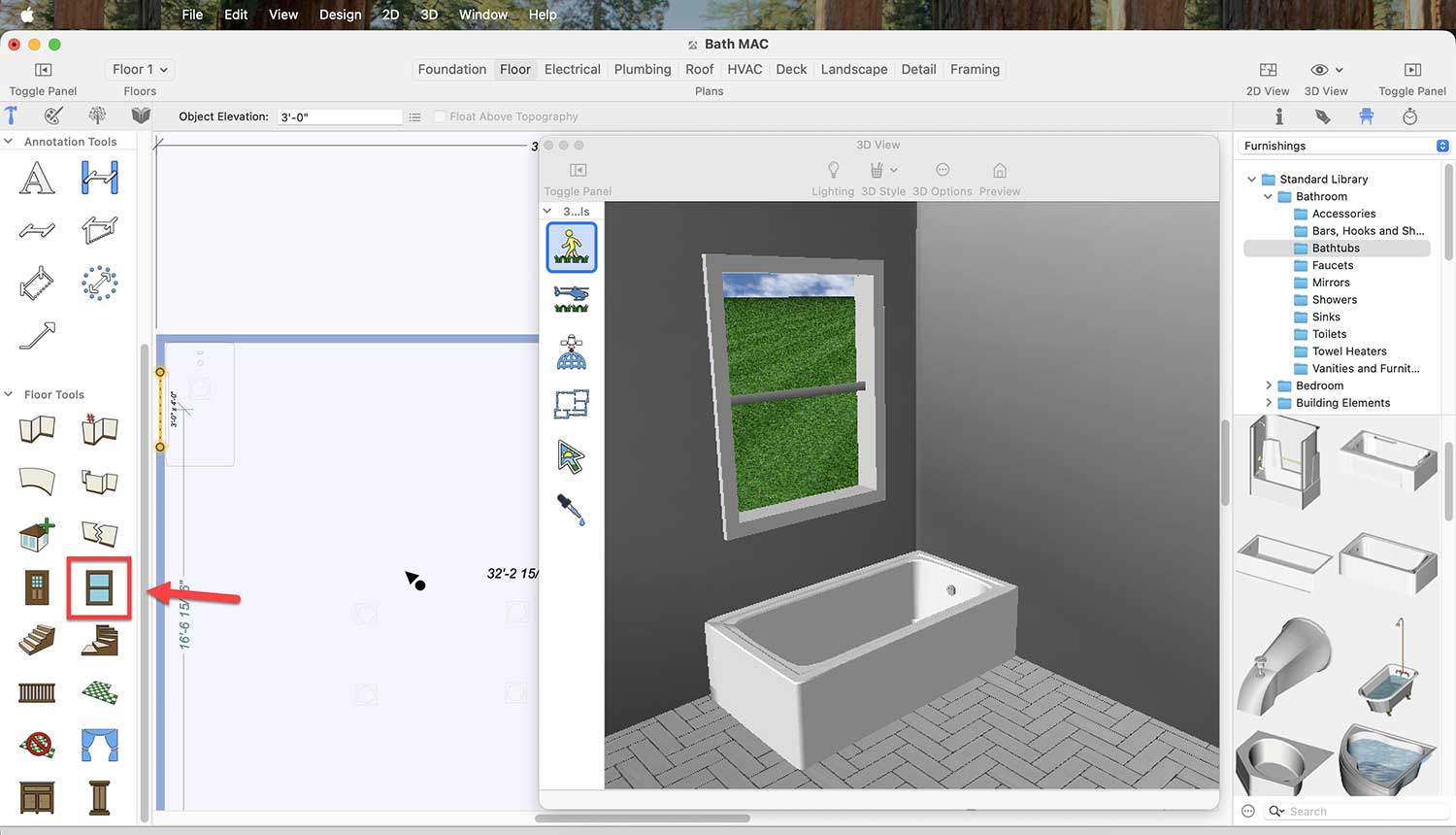 If you want to place a window in your bathroom, click on the Window icon, then simply click on the wall where you want to place the window.