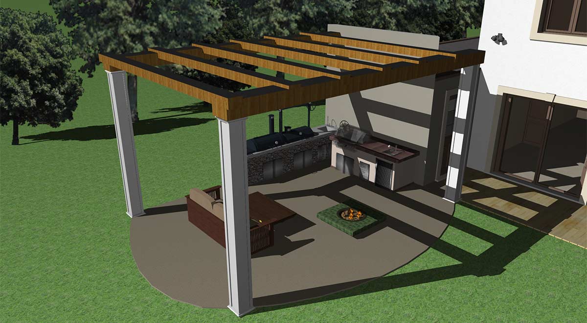 When designing an outdoor kitchen, a full roof covering the entire area can sometimes feel bulky or out of place. In many cases, exposed beams create a more open, stylish, and natural look. This application offers a variety of roofing options - including beams and trusses - that help us to build a beautiful and well-structured cover for our outdoor kitchen.