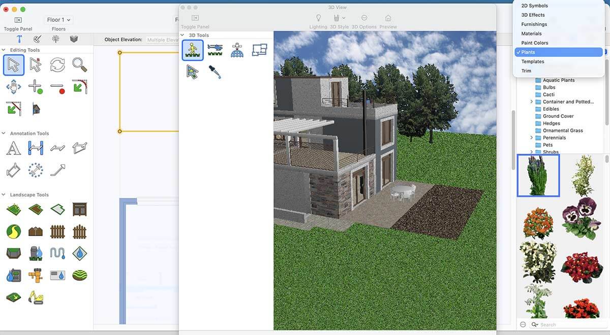 Use the Ground Fill Region tool in the Landscape tab to define your flower bed. Plants, trees, and shrubs can be added easily via drag-and-drop. With the Visual Array feature, you can place multiple elements at once—far more efficient than adding them individually.