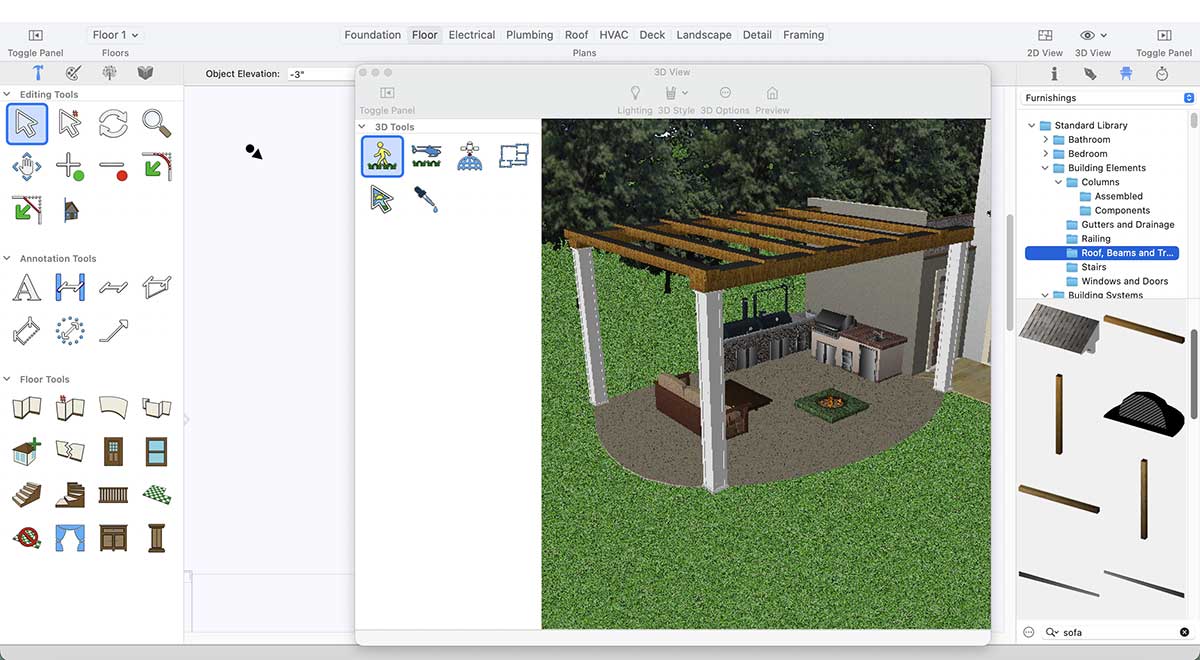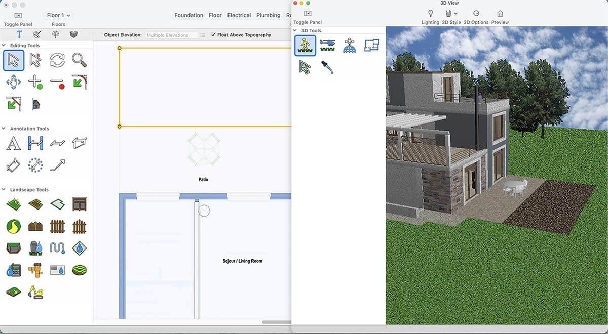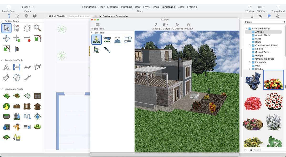 Use the Ground Fill Region tool in the Landscape tab to define your flower bed. Plants, trees, and shrubs can be added easily via drag-and-drop. With the Visual Array feature, you can place multiple elements at once—far more efficient than adding them individually.